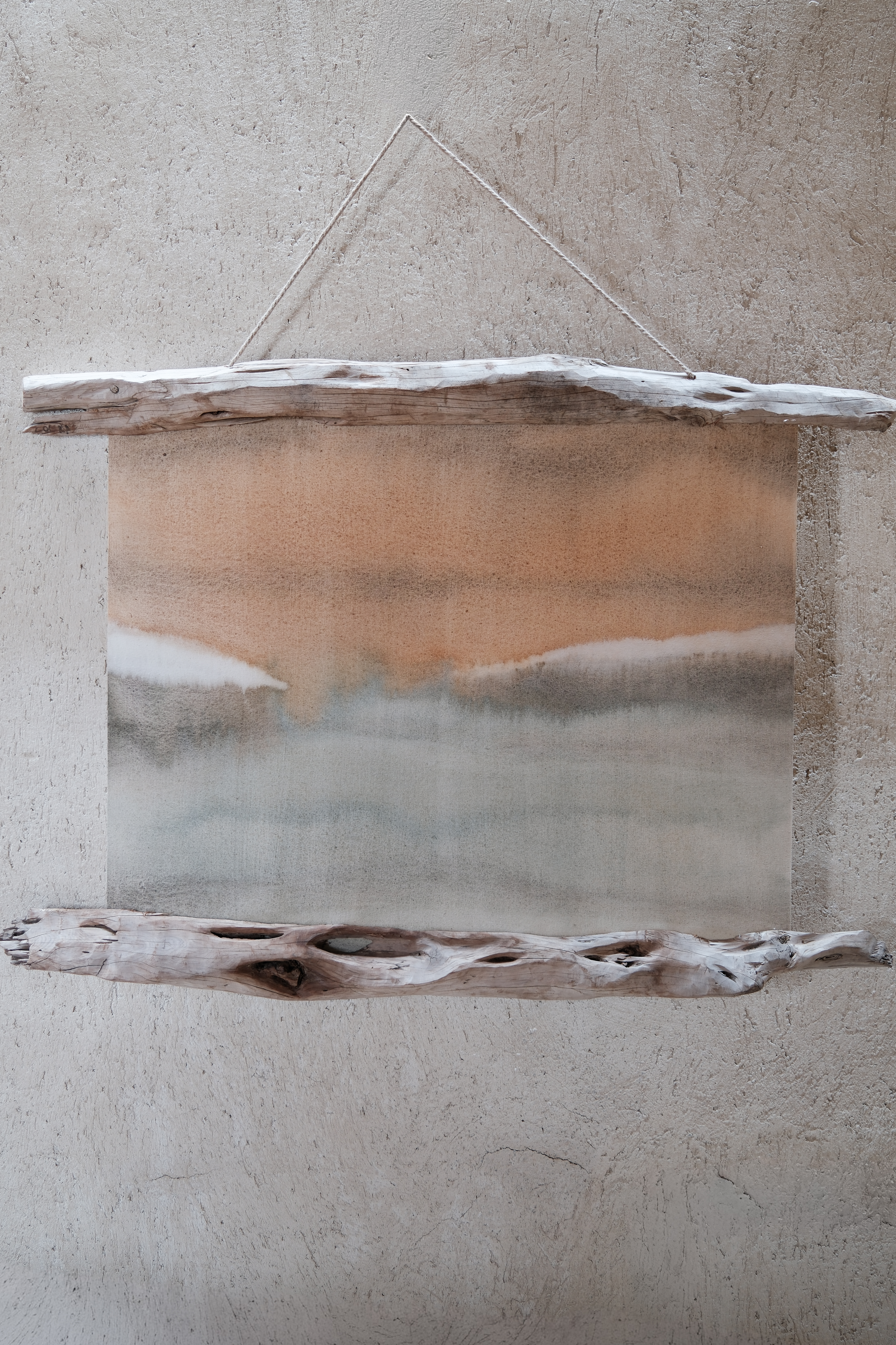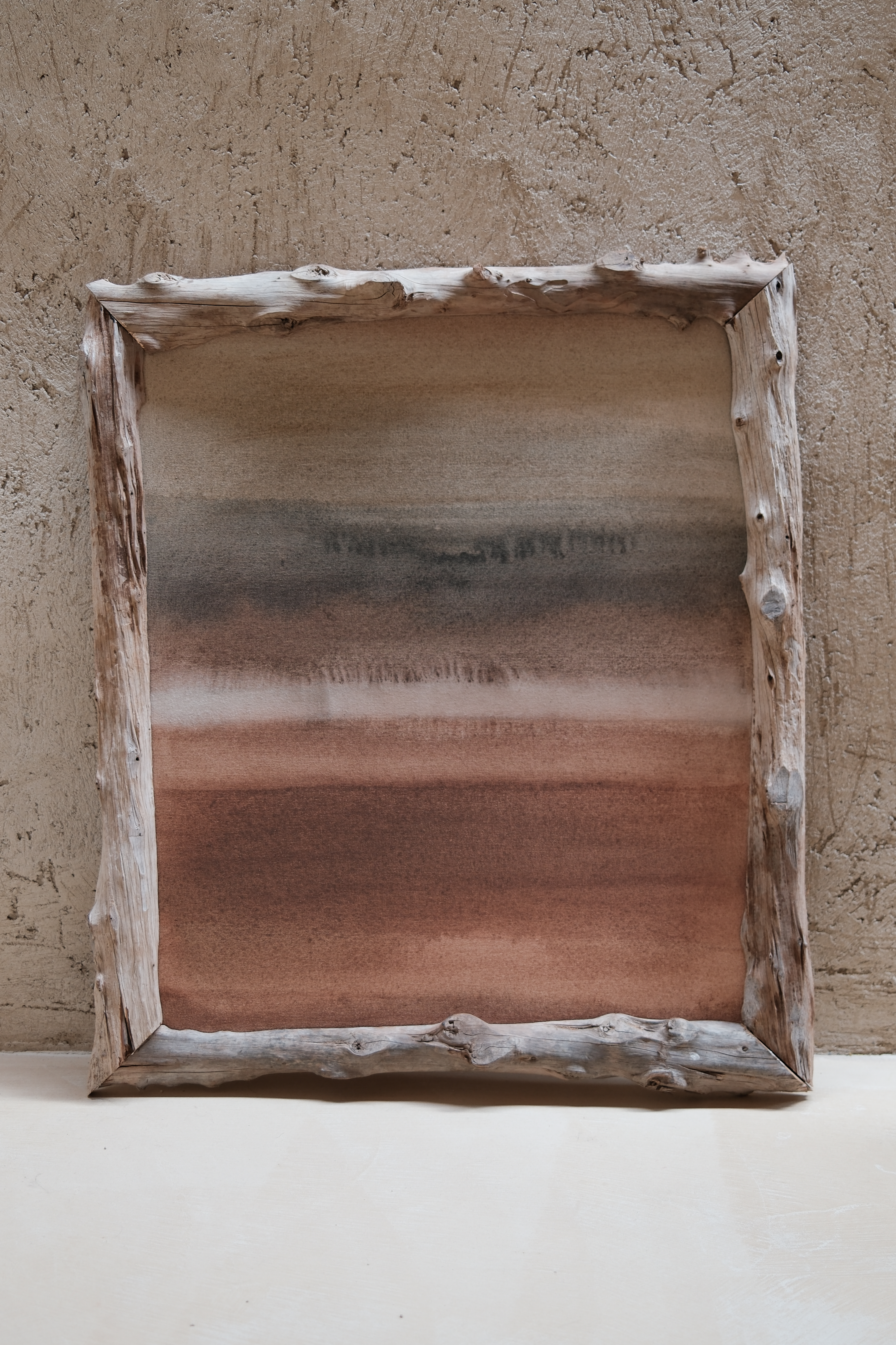 Shoreline Drift, natural pigments (orange coastal clay, indigo, charcoal and chalk) on raw cotton, sabina wood frame, 75 x 65 cm, 2026.