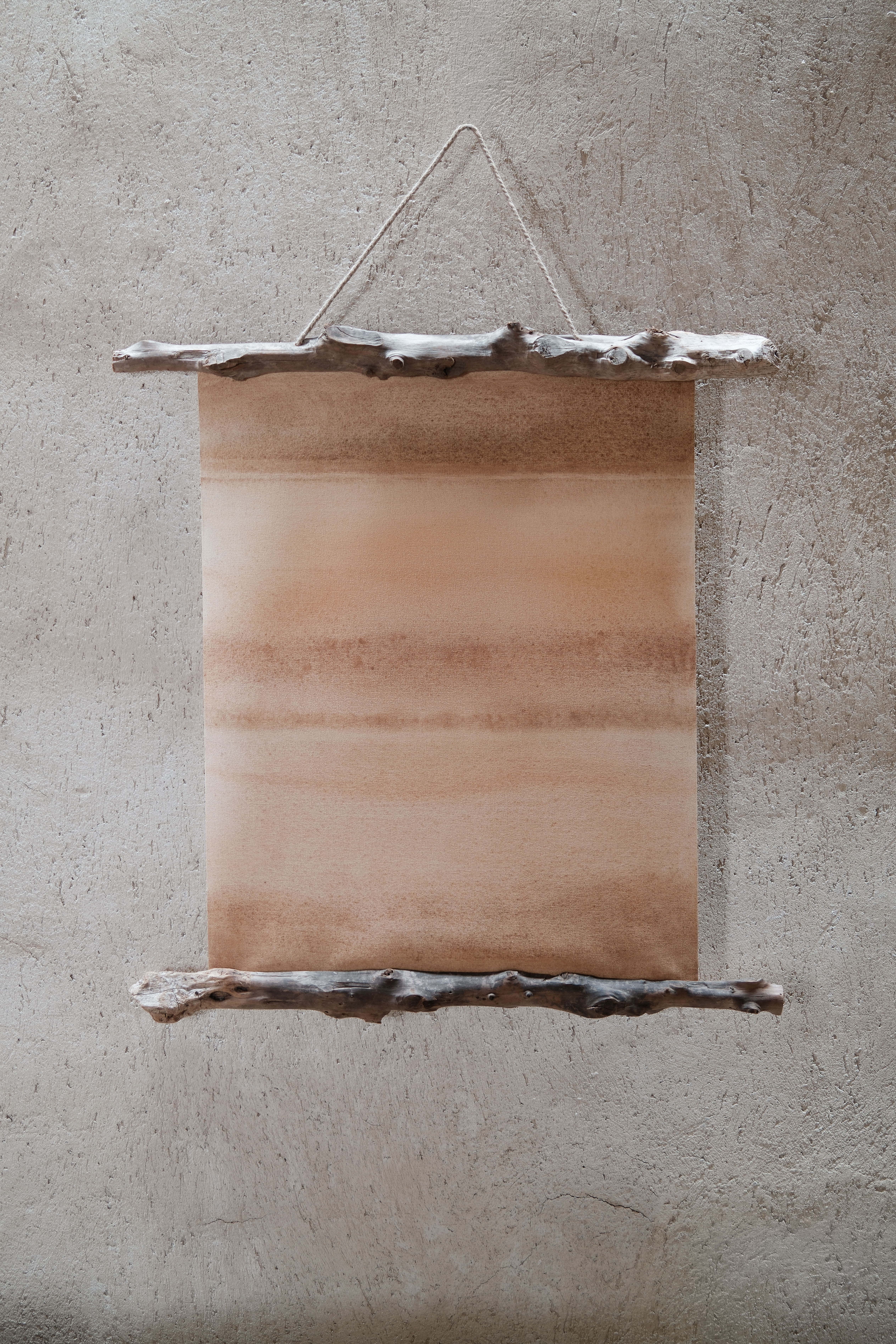 Suspended Horizon, natural pigments (orange iron-rich gypsum and chalk) on raw cotton, sabina wood frame, 90 x 30 cm, 2026.