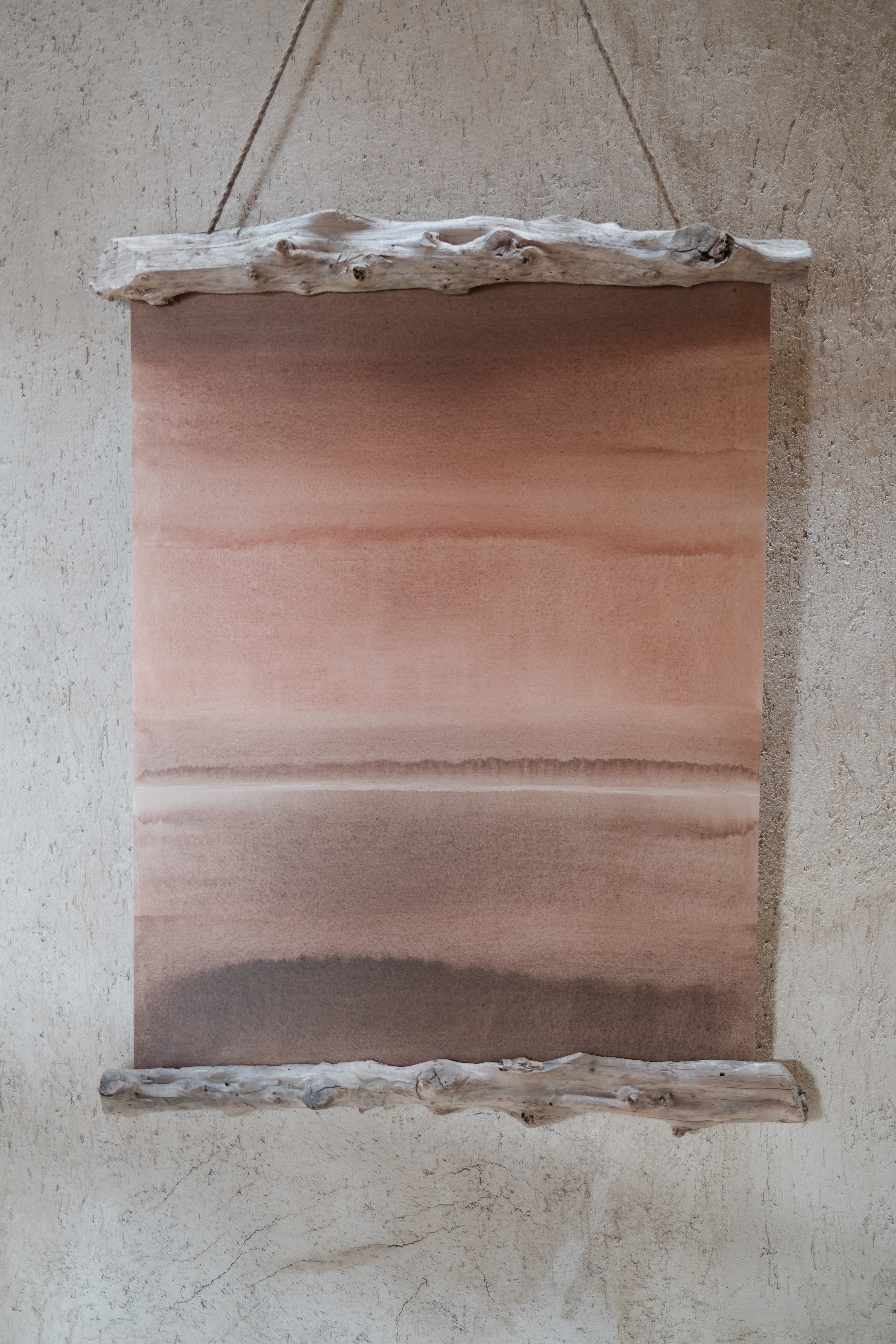 Calm after the Storm, natural pigments (red clay and charcoal) on raw cotton, sabina wood frame, 145 x 75 cm, 2025.