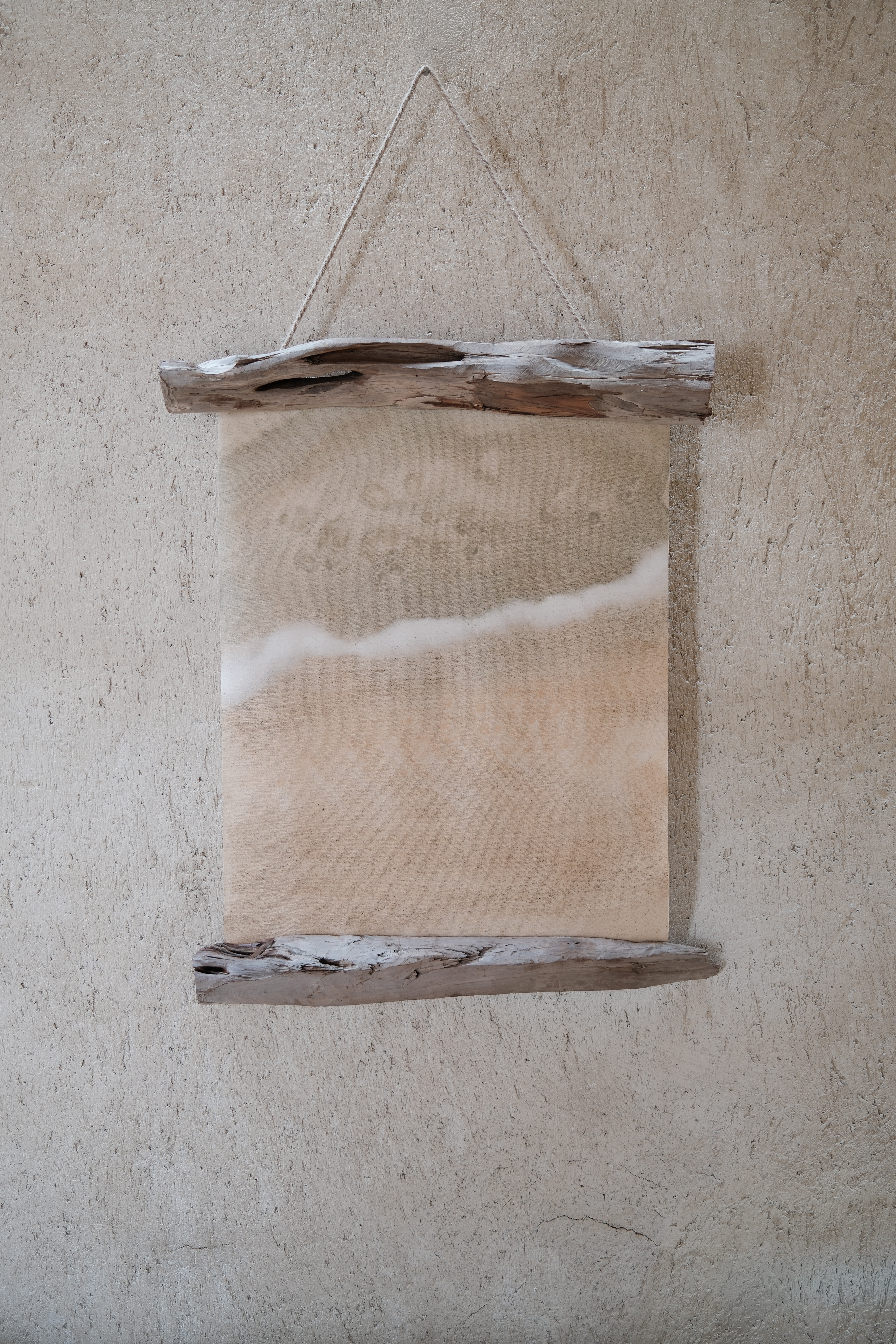 Saltwater Skies and Eroded Horizons, natural pigments (red earth, yellow ochre, indigo, charcoal and chalk) on raw cotton, sabina wood frame, 85 x 115 cm, 2026.